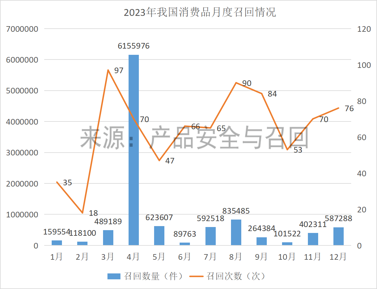 《產品安全與召回》根據市場監管總局缺陷產品管理中心發布的數據統計,2023年12月,我國共計開展消費品召回76次,涉及生產企業73家,召回產品59萬件。與11月相比,12月召回次數與數量均有所上升。