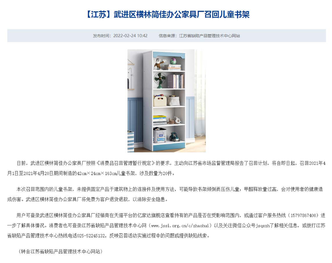 【江蘇】武進區橫林簡佳辦公家具廠召回兒童書架