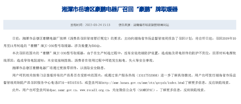 湘潭市岳塘區(qū)豪鵬電器廠召回“豪鵬”牌取暖器
