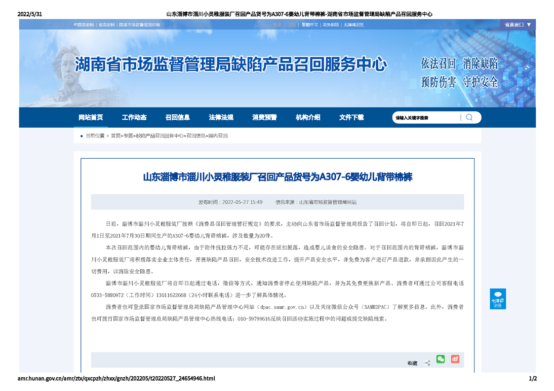 山東淄博市淄川小靈稚服裝廠召回產品貨號為A307-6嬰幼兒背帶棉褲-湖南省市場監督管理局缺陷產品召回服務中心