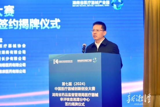 11月22日,第七屆中國醫療器械創新創業大賽暨湖南省藥品監督管理局醫療器械審評核查湘潭分中心(以下簡稱“湘潭分中心”)簽約揭牌儀式在湘潭舉行。省政協副主席、省工商聯主席、省生物醫藥及醫療器械產業鏈鏈長張健出席并講話。