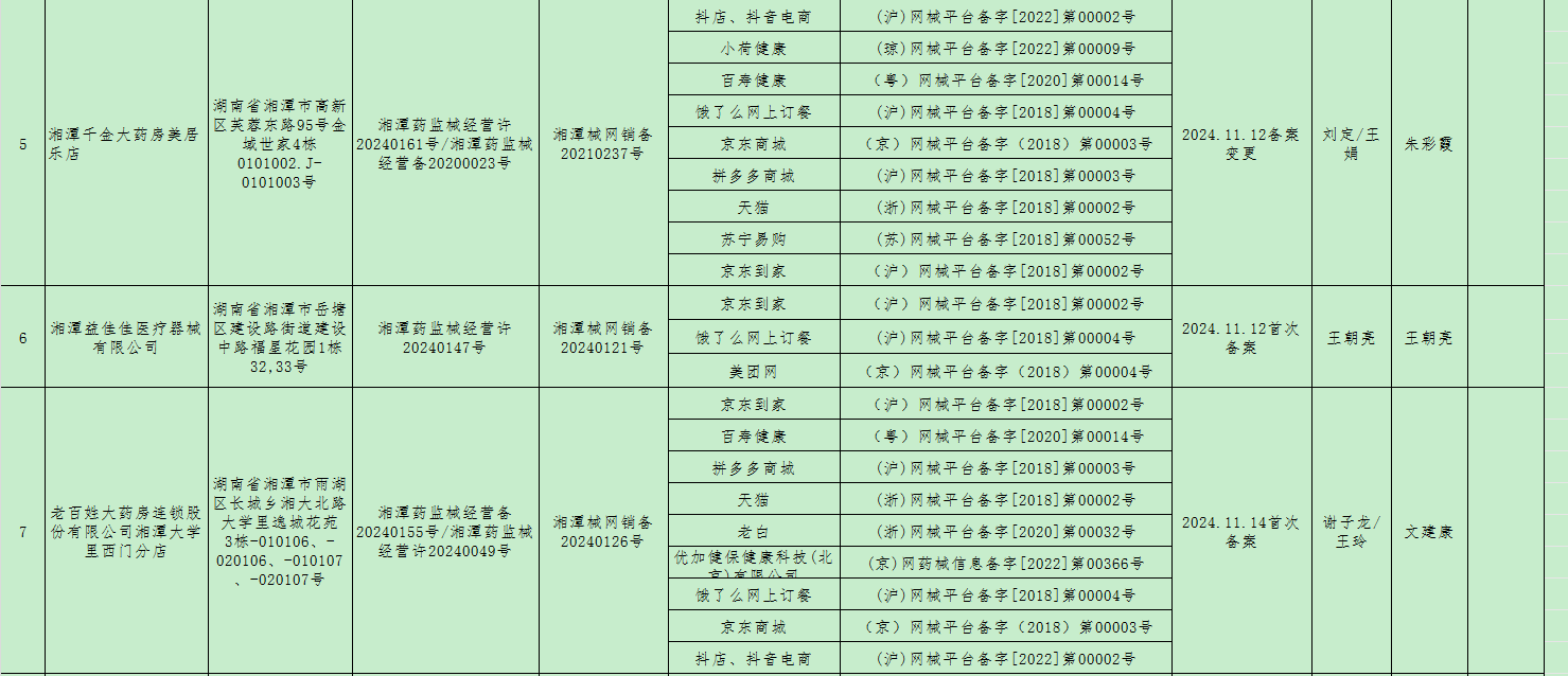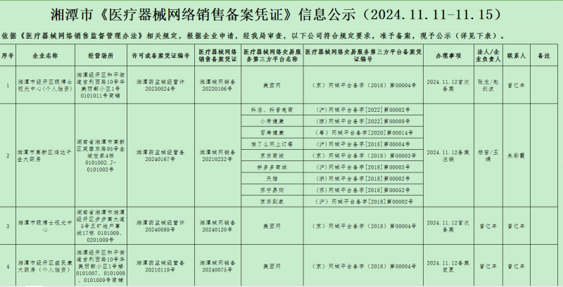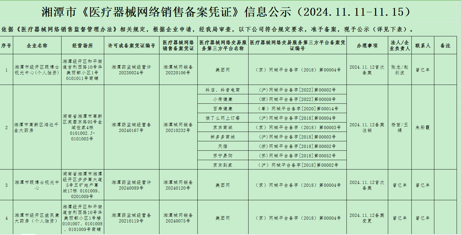 湘潭市《醫療器械網絡備案憑證》信息公示(2024.11.11-11.15)