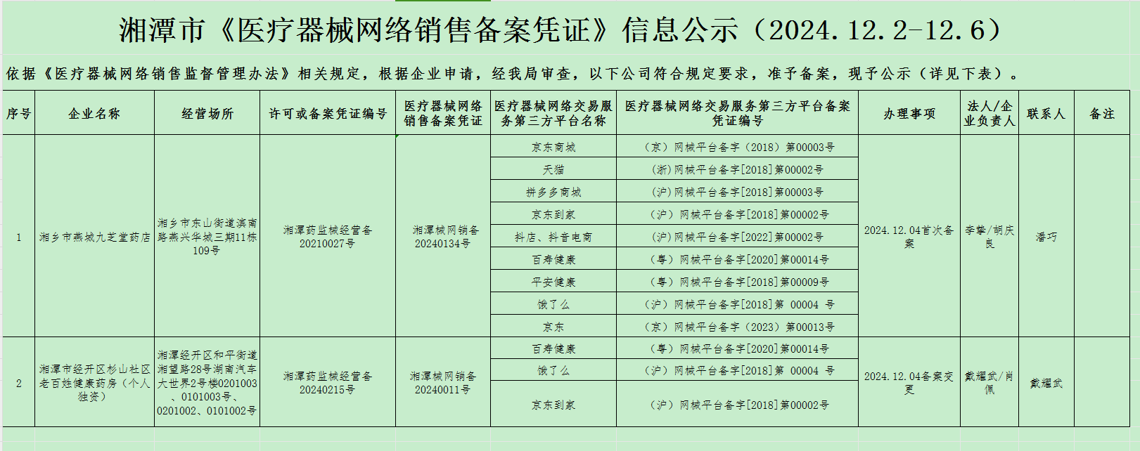湘潭市《醫療器械網絡銷售備案憑證》信息公示(2024.12.2-12.6)