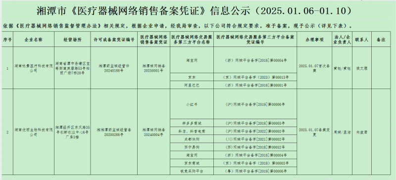 湘潭市《醫療器械網絡銷售備案憑證》信息公示(2025.01.06-01.10)