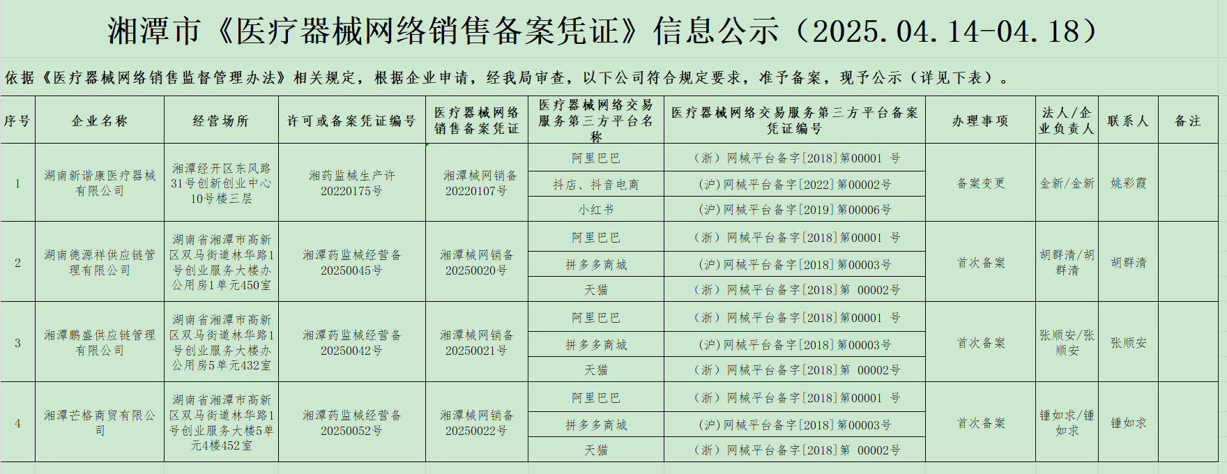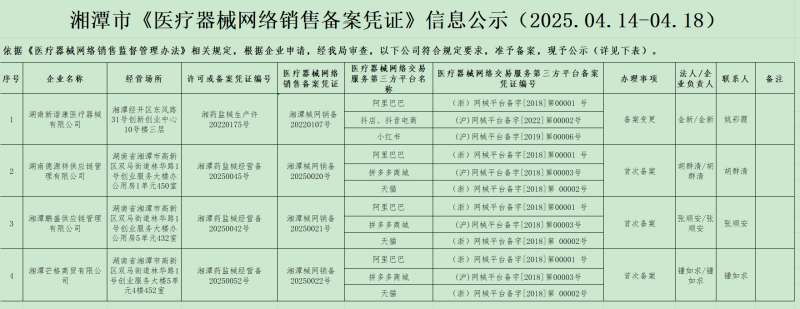 湘潭市《醫療器械網絡銷售備案憑證》信息公示(2025.04.14-04.18)