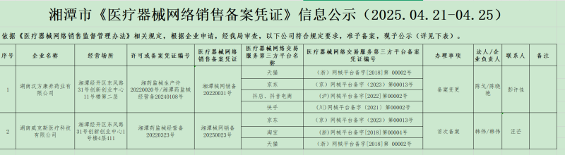 湘潭市《醫療器械網絡銷售備案憑證》信息公示(2025.04.21-04.25)