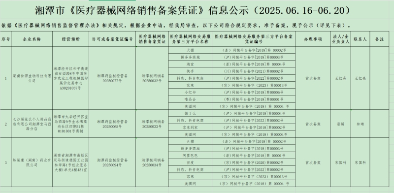 湘潭市《醫(yī)療器械網(wǎng)絡銷售備案憑證》信息公示(2025.06.23-06.27)