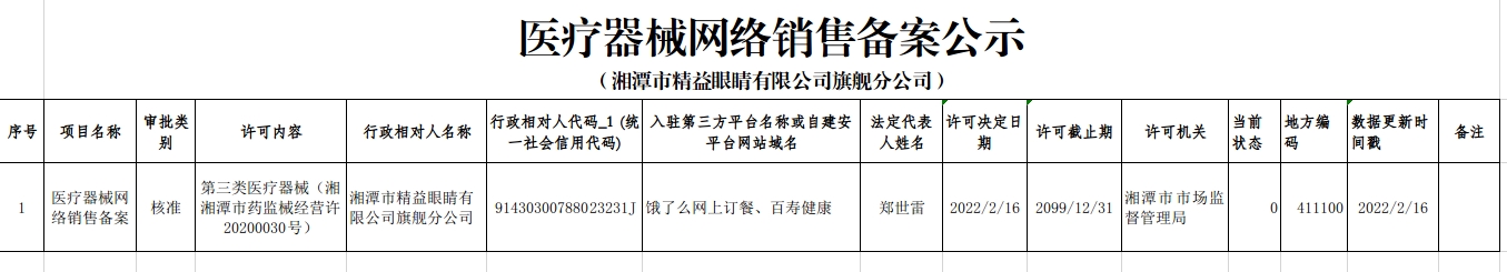 醫(yī)療器械網(wǎng)絡銷售備案公示 (湘潭市精益眼睛有限公司旗艦分公司)