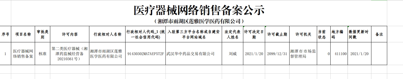 醫療器械網絡銷售備案公示 (湘潭市雨湖區蓮雅醫學醫藥有限公司)