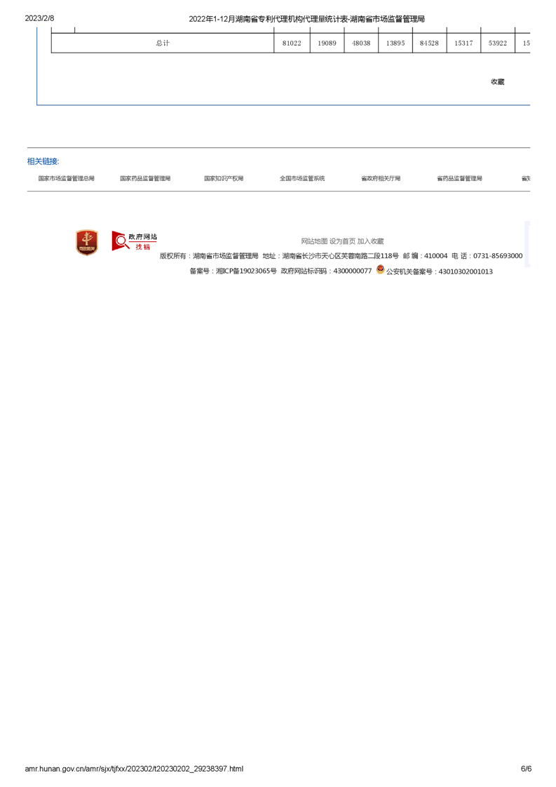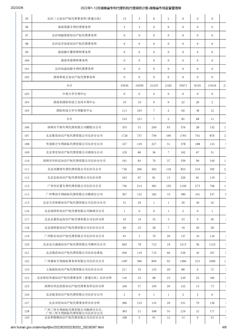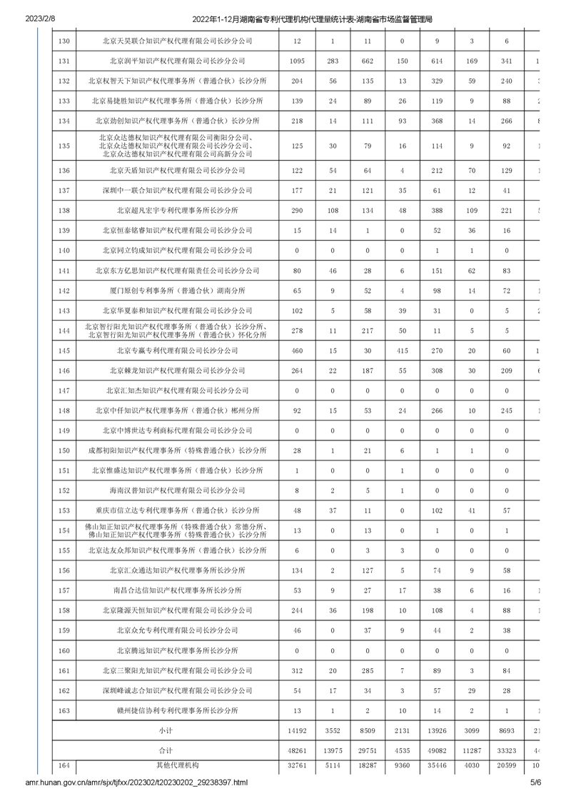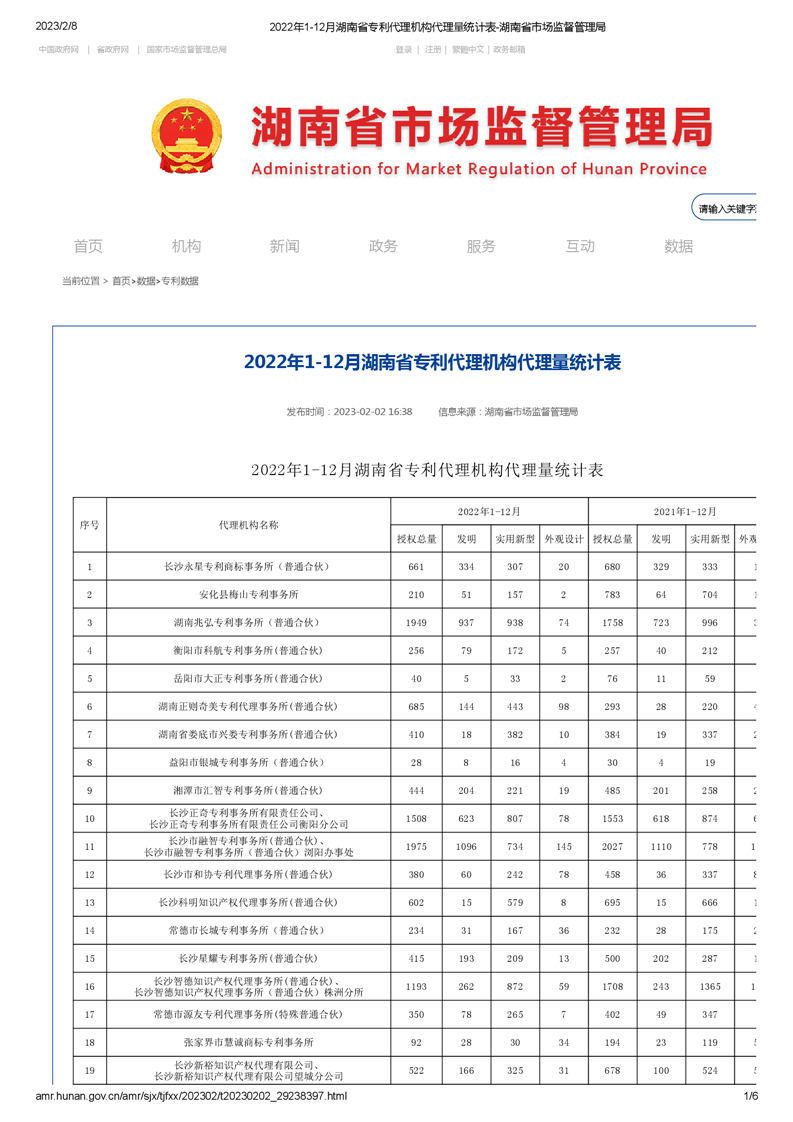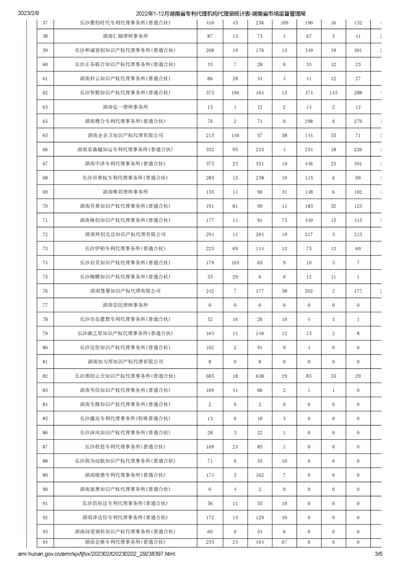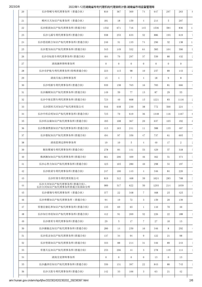 2022年1-12月湖南省專利代理機(jī)構(gòu)代理量統(tǒng)計(jì)表