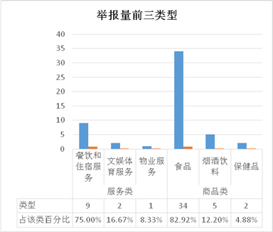 本月舉報75件,涉及商品類54件,服務類21件。商品類舉報中為食品類舉報31件,主要涉及預包裝食品標簽配料表不符合國家標準、保質期內有變質發霉現象、非食品做普通食品銷售、食品內有不可食用的異物、有明顯異味、三無產品;餐飲店衛生條件差;無證無照經營食品等食品安全問題舉報,涉嫌夸大宣傳治療作用的保健品的舉報1件;服務類舉報中,餐飲住宿服務9件,舉報商家經營場所衛生不達標,涉嫌無證無照經營、強制消費等。