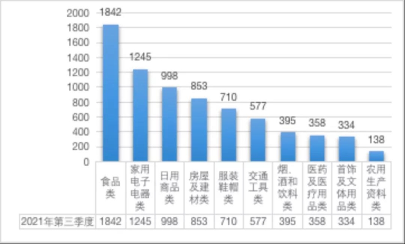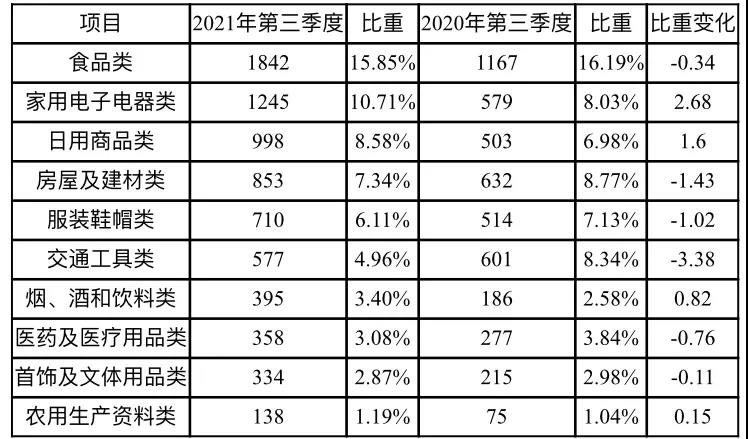 (二)商品和服務(wù)類別分析 1、商品大類投訴匯總情況分析從商品大類投訴分析,2021年第三季度,全省消保委組織共受理商品類投訴7450件(如圖2、表2所示),總體上比去年同期有所下降。其中:食品類1842件,占商品類投訴總量的24.7%,居商品類投訴第一;家用電子電器類1245件,占商品類投訴總量的16.7%;排名第二;日用商品類998件,占商品類投訴總量的13.4%,排名第三;房屋及建材類和服裝鞋帽類投訴量位列第四、第五。商品類投訴主要反映產(chǎn)品質(zhì)量、售后服務(wù)、價格等方面,與去年同期相比家用電子電器類、日用商品類的增長比重較大,特別是家用電子電器類,增長了115%。