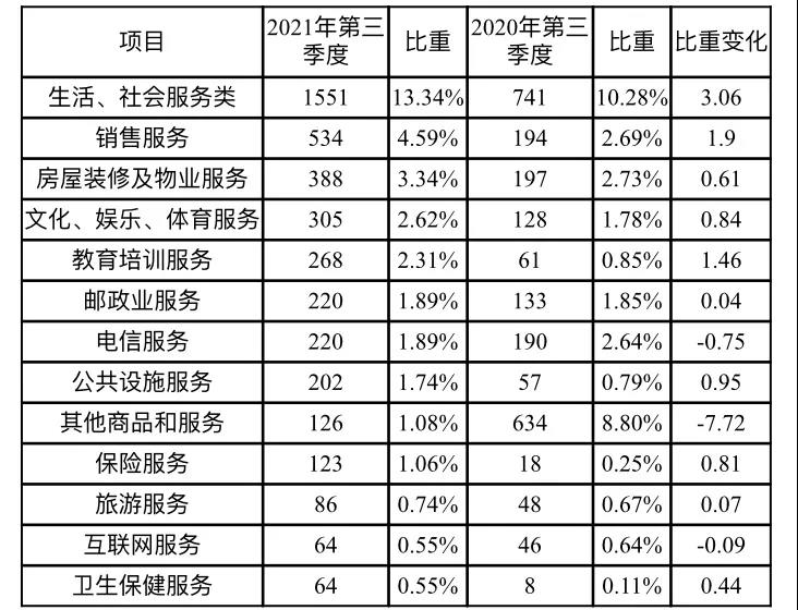 2、服務(wù)大類投訴匯總情況分析從服務(wù)大類投訴分析,2021年第三季度全省消保委組織共受理服務(wù)類投訴4151件(如圖3、表3所示)。其中:生活、社會服務(wù)類1551件,占服務(wù)類投訴總量的37.4%,位居服務(wù)類投訴第一;銷售服務(wù)534件,占服務(wù)類投訴總量的12.9%;排名第二;房屋裝修及物業(yè)服務(wù)388件,占服務(wù)類投訴總量的9.4%,排名第三;文化、娛樂、體育服務(wù)和教育培訓(xùn)服務(wù)投訴量列第四和第五位。服務(wù)類投訴主要反映在價格、服務(wù)質(zhì)量、售后服務(wù)等方面。投訴量變化幅度較大的是:生活社會服務(wù)類、銷售服務(wù)類、房屋裝修及物業(yè)服務(wù)類以及文化、娛樂、體育服務(wù)等類別,其中生活、社會服務(wù)類投訴量提升翻倍,比去年同期增加了810件,增長了109.3%。