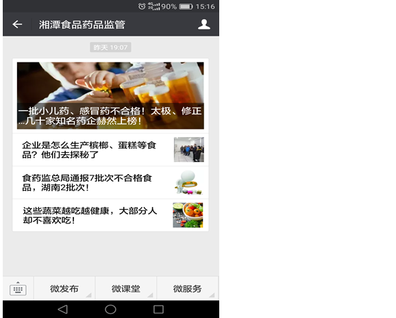3、創新政務公開方式。我局除利用局門戶網站、政務服務中心窗口進行政務公開之外,還在湘潭在線新聞網開設了“湘潭食藥監管頻道”,開通了“湘潭食品藥品監管”微信公眾號,通過多種方式發布工作動態、安全警示、政策法規、科普知識等政務信息200多條。目前微信公眾號粉絲量為1600人,訪問量達到22000次。